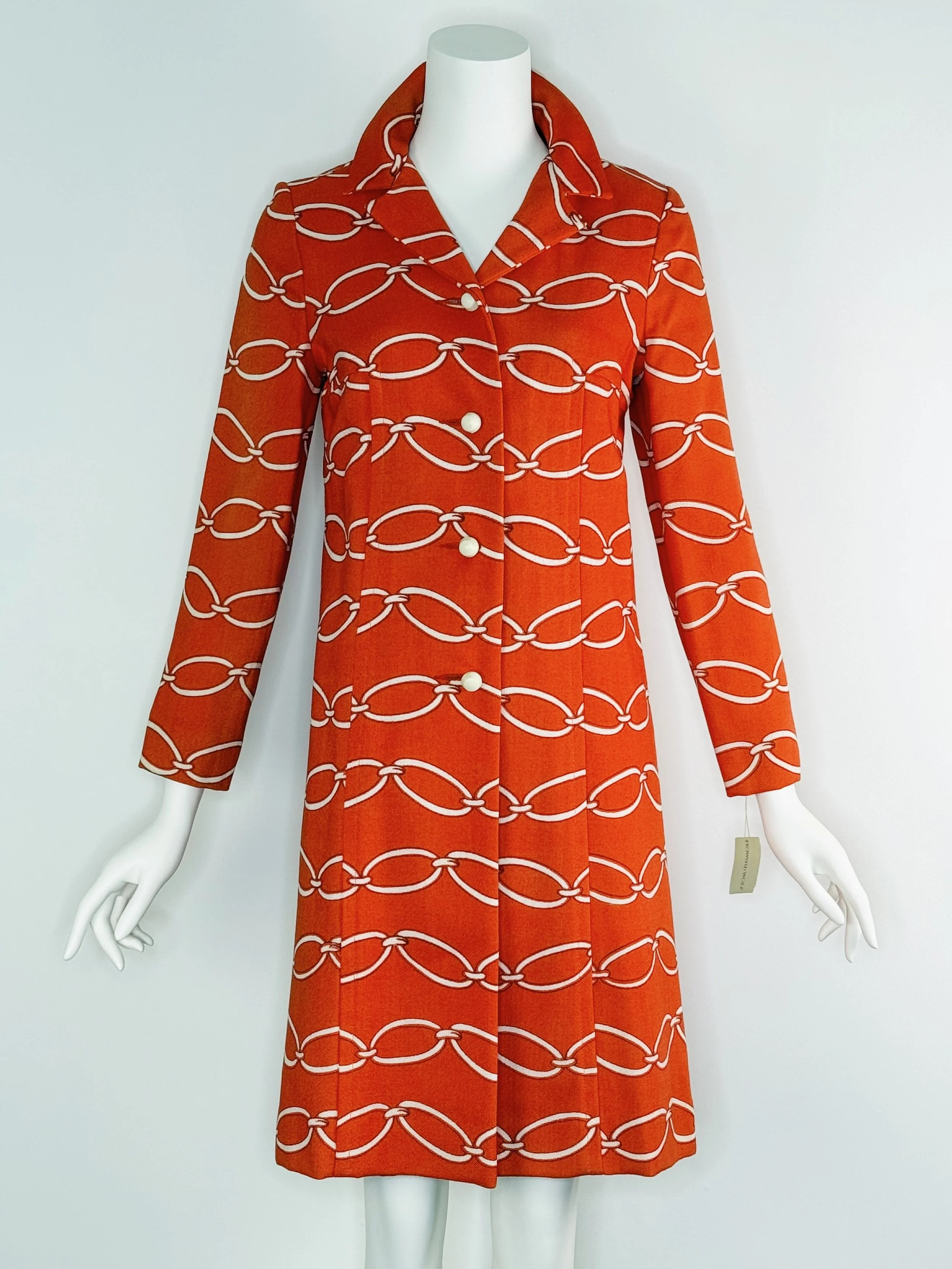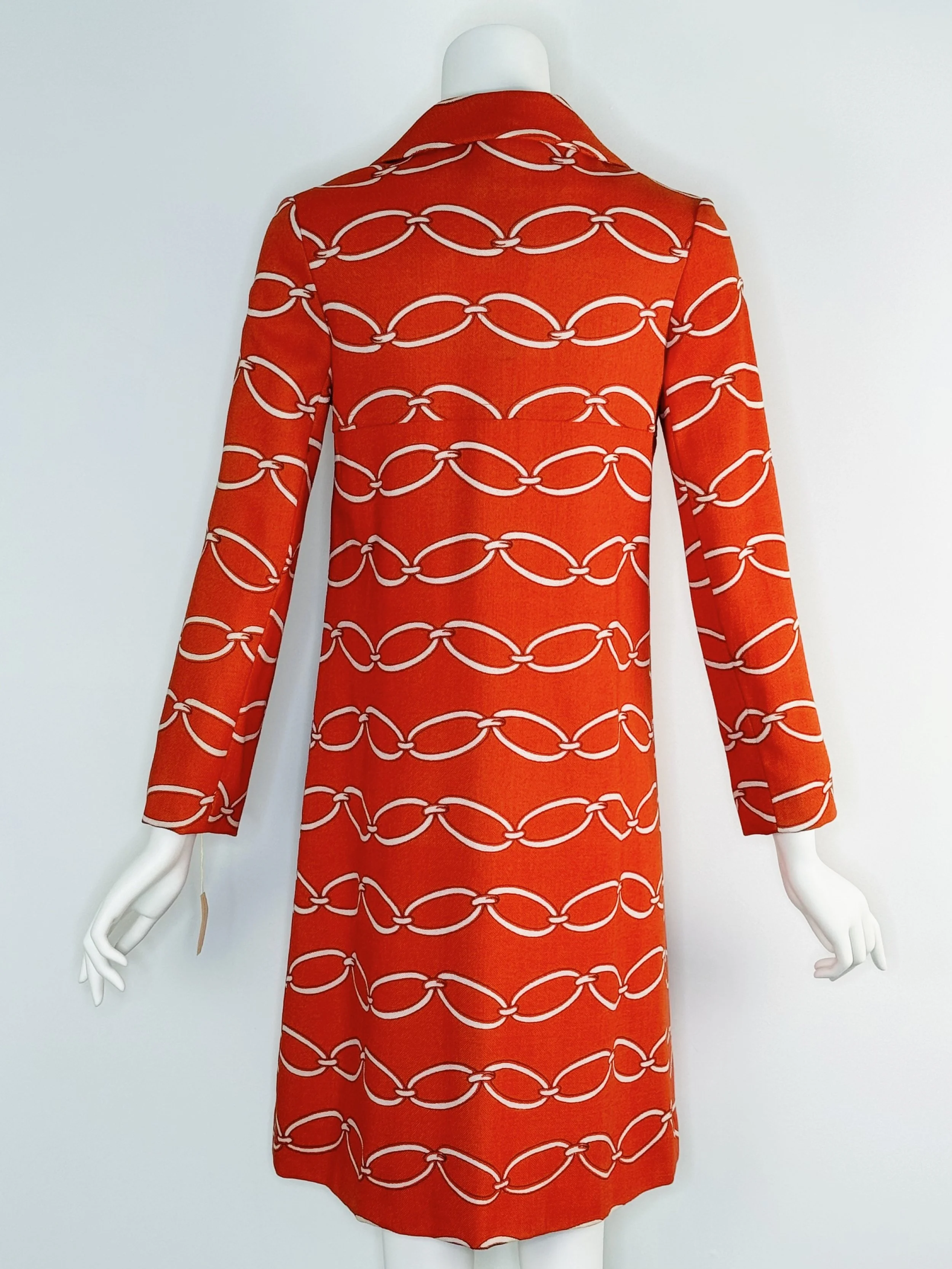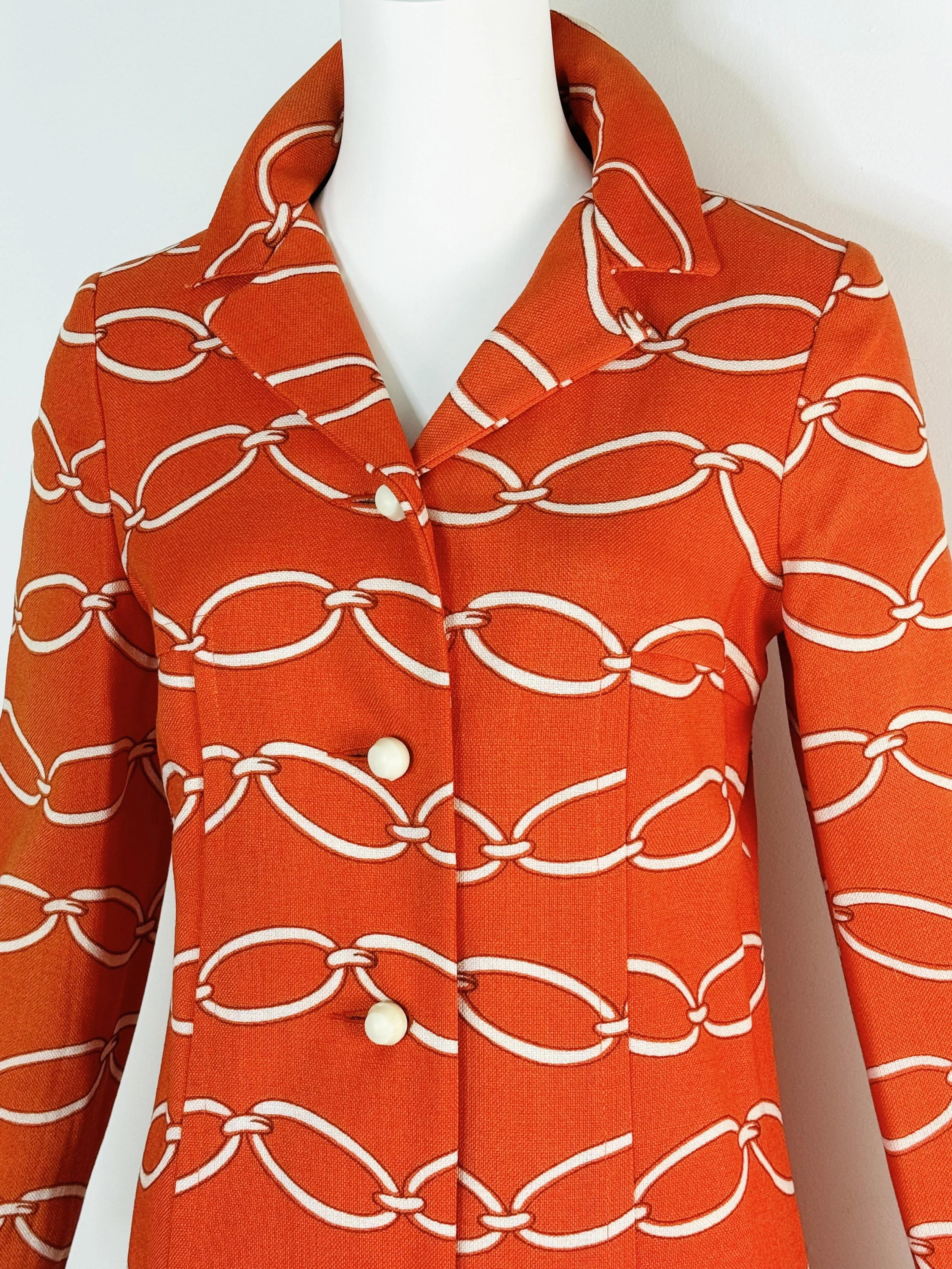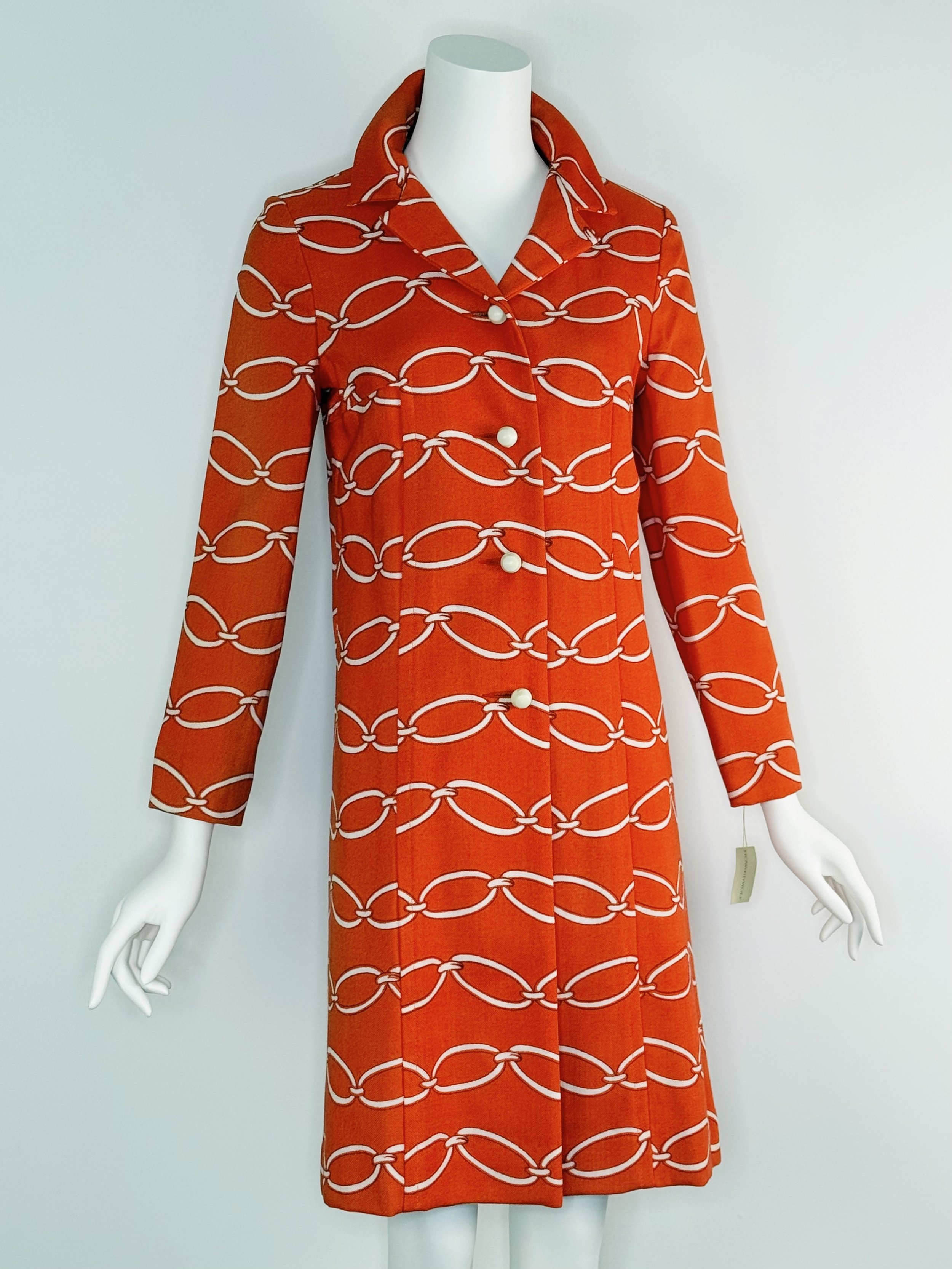 This is a deadstock 1960s Howard Wolf orange coat with an allover white chain link print. Inspired by Valentino. It has straight silhouette with long sleeves, it buttons down the front. The fabric has a textured hand that feels similar to linen, the original hang tag indicates rayon, and it is fully lined in acetate. This coat is in very good condition, small very light spots on the inside bottom hem of the lining and one small light spot at the back. Best suited for a small. My dress form is an extra small for reference:
